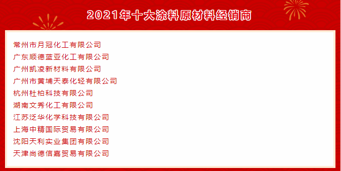 作為涂料行業最大的新媒體服務平臺,涂料采購網于2021年11月中旬發起“2021年度十大涂料供應商”線上評選活動,經過緊張而又激烈的線上競爭以及1年的實地調研,最終評選出了“2021年度十大涂料供應商”,為涂料企業在2022年的原材料采購方面提供了切實可行的參考。