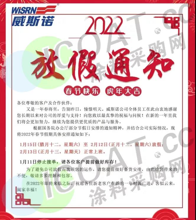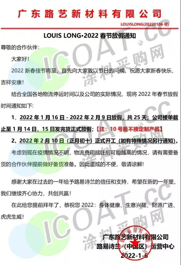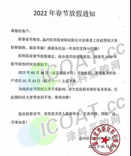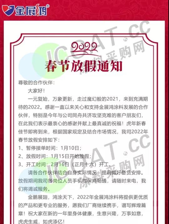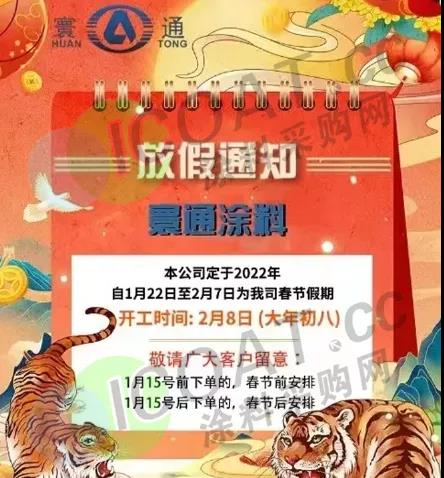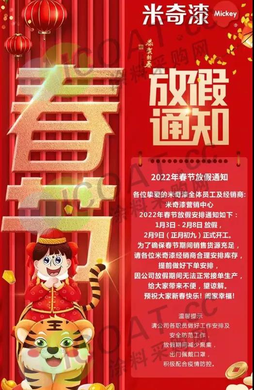 據涂料采購網了解,2022年以來,已有30余家涂料、化工企業發布了放假通知,最早于本月3日已經開始放假,最晚開工時間為2月16日(正月十六),最長放假37天。與往年相比,2022年許多涂料企業的放假提前了不少,且明確放假期間不生產、不發貨、不接單,提醒客戶提早安排備貨事宜。