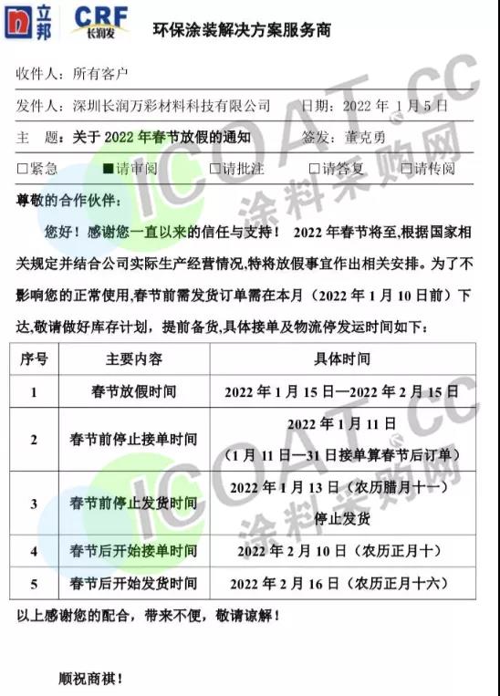 立邦長潤發:春節放假時間:2022年1月15日一2022年2月15日;春節前停止接單時間:2022年1月11日(1月11日-31日接單算春節后訂單);春節前停止發貨時間:2022年1月13日停止發貨;春節后開始接單時間;2022年2月10日;春節后開始發貨時間:2022年2月16日。