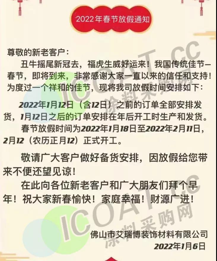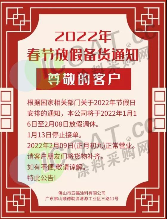 佛山市五福涂料:將于2022年1月16日至2月8日放假調休。1月13日停止接單,2022年2月9日正常營業。