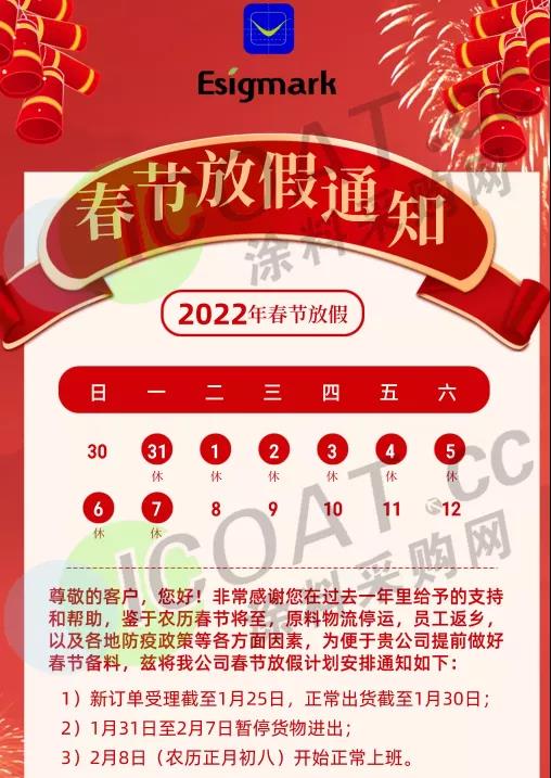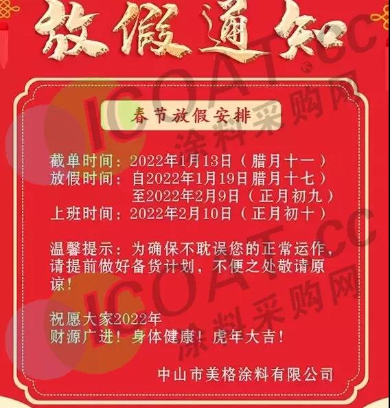 中山市美格涂料:截單時間:2022年1月13日;放假時間:自2022年1月19日至2022年2月9日;上班時間:2022年2月10日。