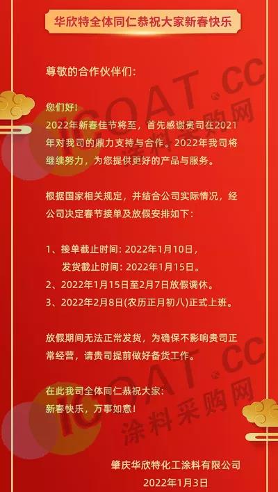 肇慶華欣特化工涂料:接單截止時間:2022年1月10日,發貨截止時間:2022年1月15日。2022年1月15日至2月7日放假調休。2022年2月8日正式上班。