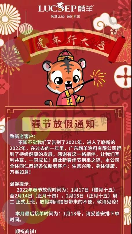 廣東麟羊涂料:春節放假時間為:1月17日至2月14日,2月15日周二正式上班,本月最后接單時間為:1月13號,請妥善安排下單時間。