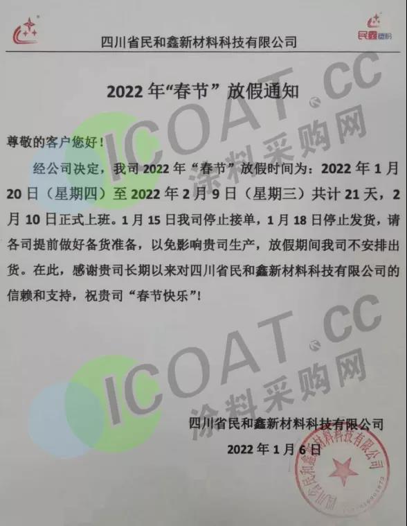 四川省民和鑫新材料科技有限公司:2022年“春節”放假時間為:2022年1月20日至2022年2月9日共計21天,2月10日正式上班。1月15日停止接單,1月18日停止發貨,請各司提前做好備貨準備,以免影響貴司生產,放假期間不安排出貨。