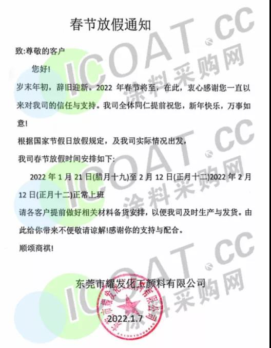 東莞市耀發化工顏料有限公司:2022年1月21日至2月12日放假,2022年2月12日正常上班。