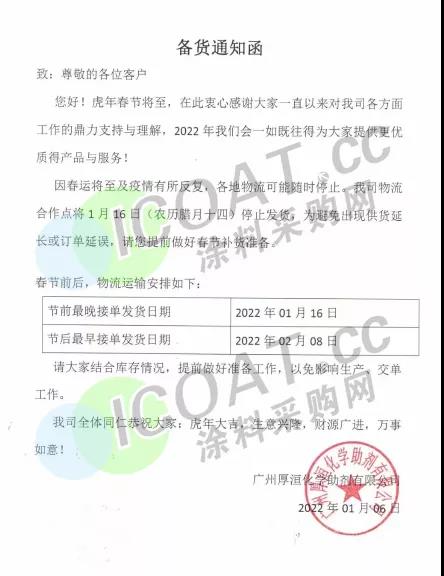 廣東厚洹化學助劑:節前最晚接單發貨日期:2022年1月16日,節后最早接單發貨日期:2022年2月8日。