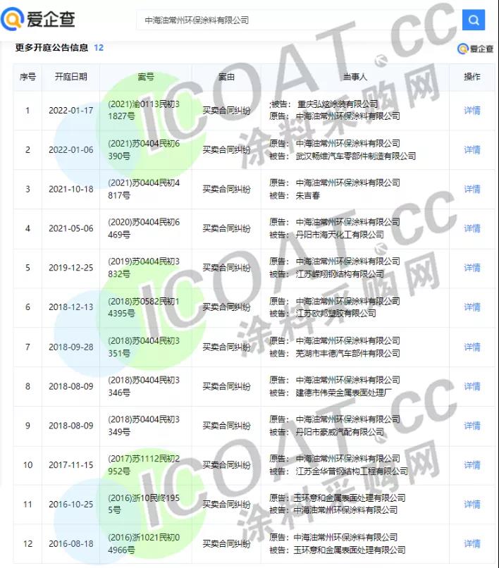 涂料采購(gòu)網(wǎng)查詢得知,中海油常州環(huán)保涂料有限公司近期官司頻頻,共計(jì)12起開(kāi)庭公告,橫跨2016年至2022年6年光景,案由均為“買賣合同糾紛”,僅2022年就有2次開(kāi)庭公告,被告分別為武漢暢維汽車零部件制造有限公司和重慶弘炫涂裝有限公司。