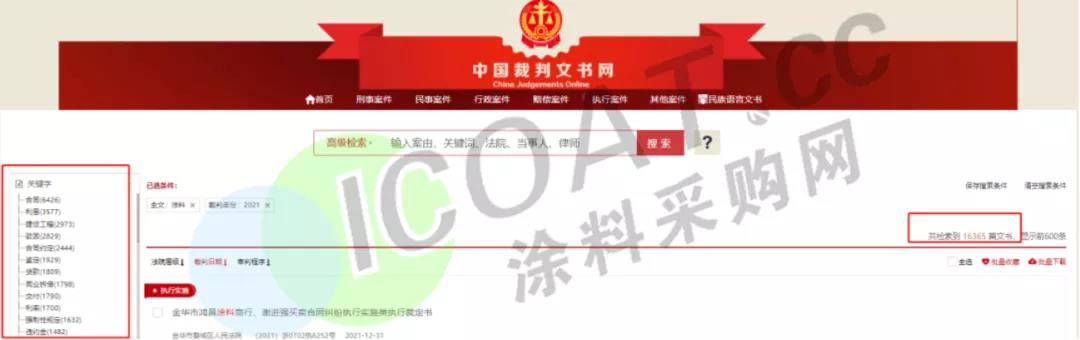 據(jù)裁判文書網(wǎng)數(shù)據(jù),僅2021年涂料行業(yè)涉及官司訴訟的超過(guò)16000篇文書,排名靠前的訴訟關(guān)鍵字為合同(6426篇)、利息(3577片)、建設(shè)工程(2973篇),區(qū)域覆蓋了北京、天津、河北、陜西、遼寧、江蘇、山東、陜西等30余個(gè)省市地區(qū),涉及到一審、二審等多種不同的情況,據(jù)涂料采購(gòu)網(wǎng)不完全統(tǒng)計(jì),近1000家涂料企業(yè)以原告/被告等身份被卷入官司訴訟。