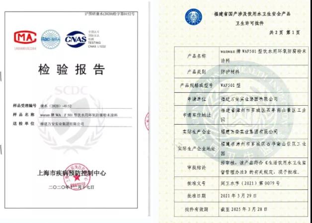 經上海市疾病預防控制中心檢驗,萬安WAF501型飲水用防腐粉末涂料涂色度、渾濁度、臭和味、鋁、鉛、汞、甲醛、環氧氯炳烷、苯乙烯等諸項指標均符合《生活飲用水輸配水設備及防護材料衛生安全評價規范》(衛生部,2001)對防護材料的衛生要求。且最終通過了福建省衛生健康委員會審核,產品符合《生活飲用水衛生監督管理辦法》的有關規定。并予以批準可應用于城鎮居民飲用水供水管道內外防腐。
