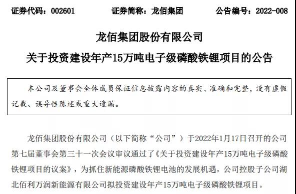 龍佰集團公告稱,為抓住新能源磷酸鐵鋰電池產業的發展機遇,公司控股子公司湖北佰利萬潤新能源有限公司擬投資建設年產15萬噸電子級磷酸鐵鋰項目。項目總投資20億元。