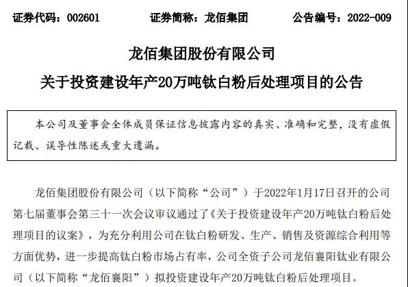 龍佰集團發布公告,為充分利用公司在鈦白粉研發、生產、銷售及資源綜合利用等方面優勢,進一步提高鈦白粉市場占有率,公司全資子公司龍佰襄陽鈦業有限公司擬投資建設年產20萬噸鈦白粉后處理項目,項目總投資10億元。