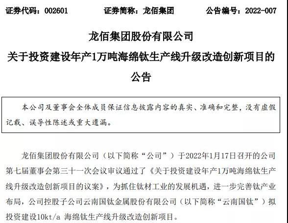 龍佰集團發布公告,為抓住鈦材工業的發展機遇,進一步完善鈦產業布局,公司控股子公司云南國鈦金屬股份有限公司(以下簡稱“云南國鈦”)擬投資建設10kt/a 海綿鈦生產線升級改造創新項目。