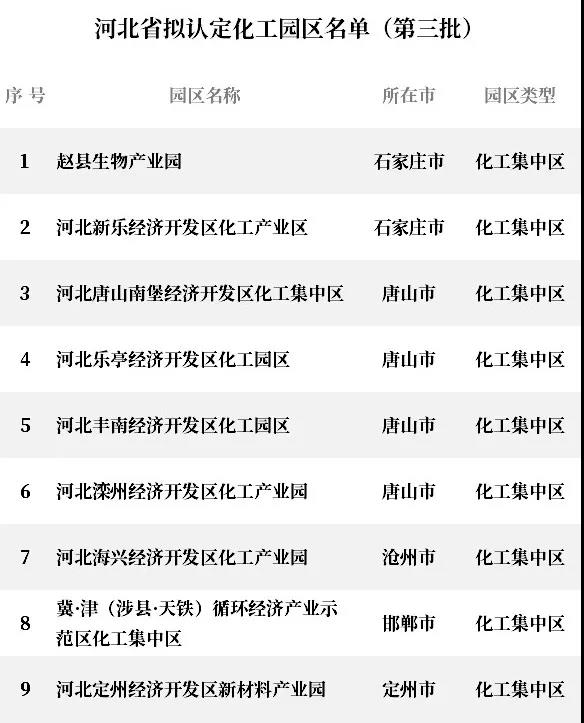 近日,河北省工信廳公示擬認定化工園區名單(第三批),包含趙縣生物產業園、河北新樂經濟開發區化工產業區等9家化工集中區。