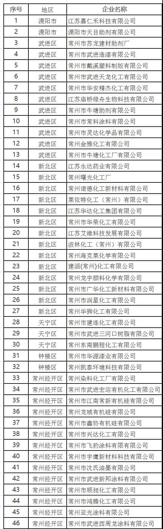 近日,江蘇省常州市工業(yè)和信息化局公示2021年常州市已關(guān)停江蘇嘉仁禾科技有限公司等46家化工生產(chǎn)企業(yè)名單。