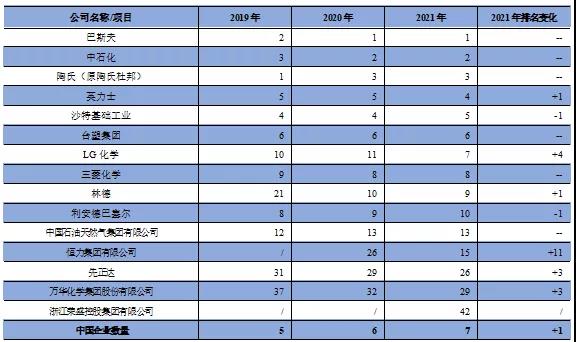 注:1.2018年起中國企業含中國化工集團收購的總部位于瑞士的先正達;2.2019年起因化學品銷售收入拆分披露,中石油進入榜單