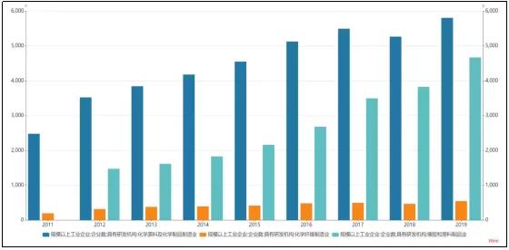 隨著相關高新技術產業不斷向中國轉移,催生了相關材料的市場需求,同時也為中國化工材料的自主發展奠定了基礎。與此同時,在國家政策大力支持新材料產業發展背景下,依托化工企業充裕的現金流支撐,驅動中國化工企業研發團隊不斷壯大。近十年,中國化工行業規模以上企業具備研發機構企業數總體保持增長,2019年中國具備研發機構的規模以上化學原料及化學制品制造業工業企業已達5806個,較2011年大幅增長134.11%。