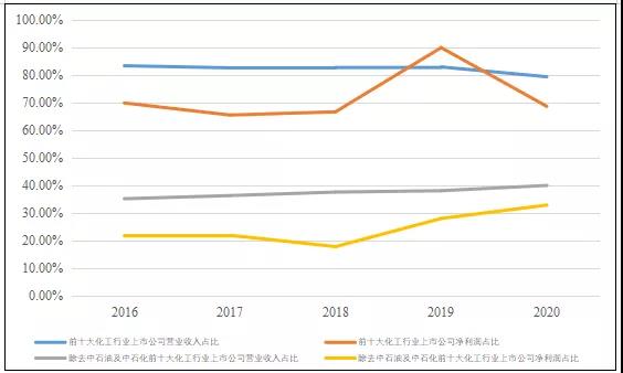 同時,筆者篩選了申萬一級行業為化工的328家上市公司以及中國石油天然氣股份有限公司(以下簡稱“中石油股份”)。近年來前十大中國化工上市企業收入及利潤占比很高,2020年分別為79.32%和68.64%;前十大中國化工上市企業營業總收入占比最高為2016年的83.30%,凈利潤占比最高為2019年的89.86%。即使剔除體量巨大的中石油股份及中國石油化工股份有限公司,近年來前十大中國化工上市企業收入及利潤占比也總體呈上升趨勢。化工行業收入和利潤的集中,顯示行業逐步凸顯的頭部優勢。