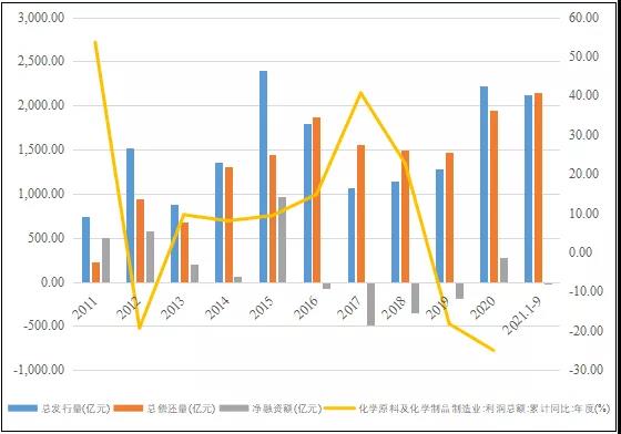 中國化工行業公司的債券融資需求與行業的盈利水平關聯度很高,債券發行量和償還量整體呈上升趨勢。