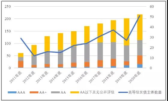 從中國化工行業發債主體數量來看,根據Wind行業分類,2011年以來中國化工行業債券發行主體不斷增加,截至2020年底共計218個,較2011年底的61個大幅增加。考慮到中國債券發行主體資質要求較高,發行主體數量的增加可以在一定程度上顯示中國化工企業經營規模和經營? 能力的提升。