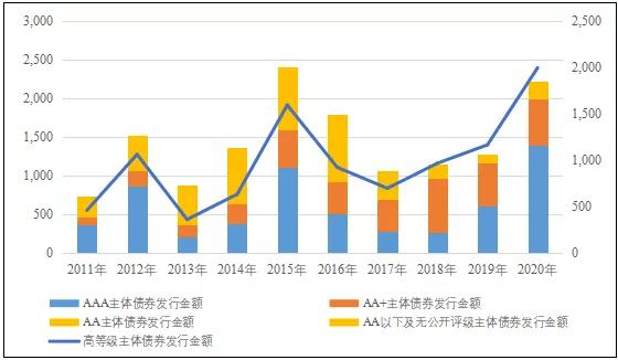 圖19 近年來中國化工企業債券不同級別主體發行金額情況
