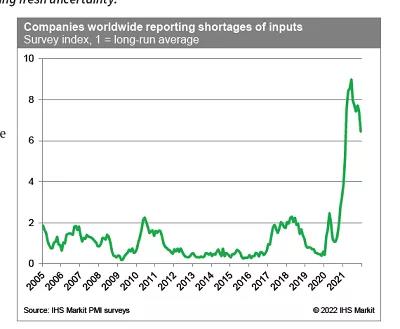 然而,在史無前例的供應中斷的背景下,根據IHS Markit對采購經理30年來的調查,歷史上供應商的交貨時間從沒有拖長到如2021年的程度。進入2022年,雖然情況略有好轉,但報告產出受到短缺限制的企業仍是長期平均值的3.5倍。另外,供應商平均交貨時間的延長有所緩解,但仍然遠遠超過了疫情之前的水平。