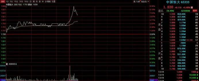 話音剛落,午后港股中國恒大便直線拉升,隨后有所回落,最終收漲4.65%,報1.80港元/股,總市值237.68億港元。
