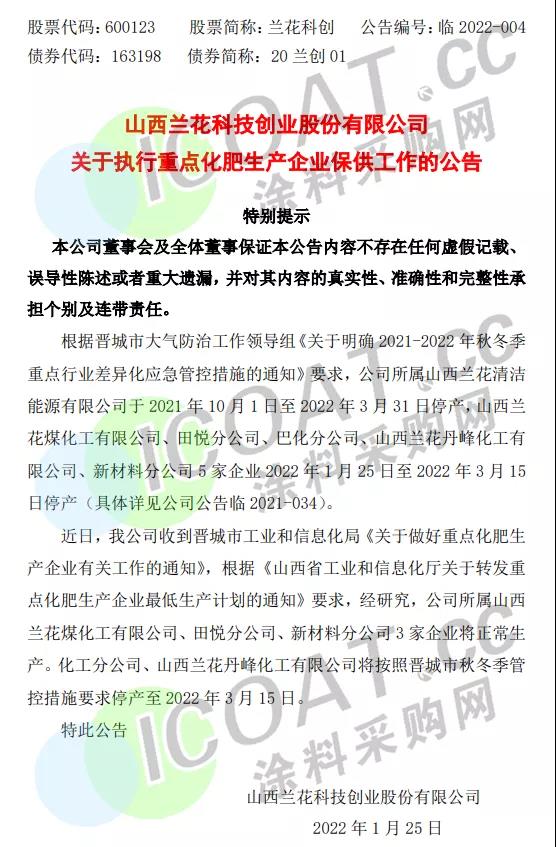 此前蘭花科創曾于去年10月公告多家分公司有序停產,而近日最新的公告也讓大家把目光再一次聚焦到化工行業的停工停產上面。據涂料采購網了解,盡管往年春節前眾多企業也在陸續放假,但今年的假期顯然來的更早,停產停工、停車檢修的企業也更加密集。