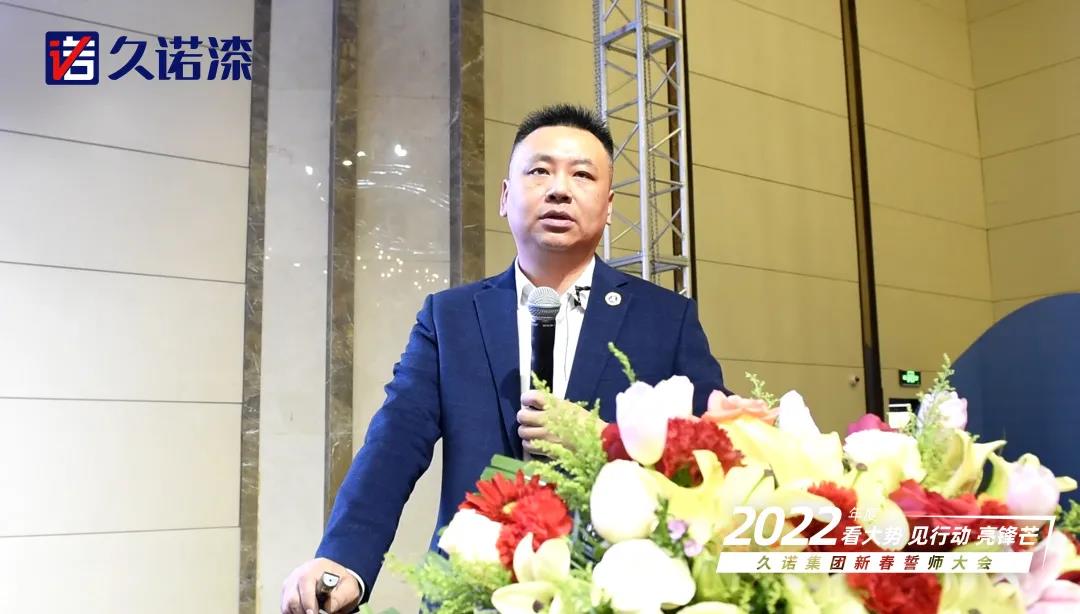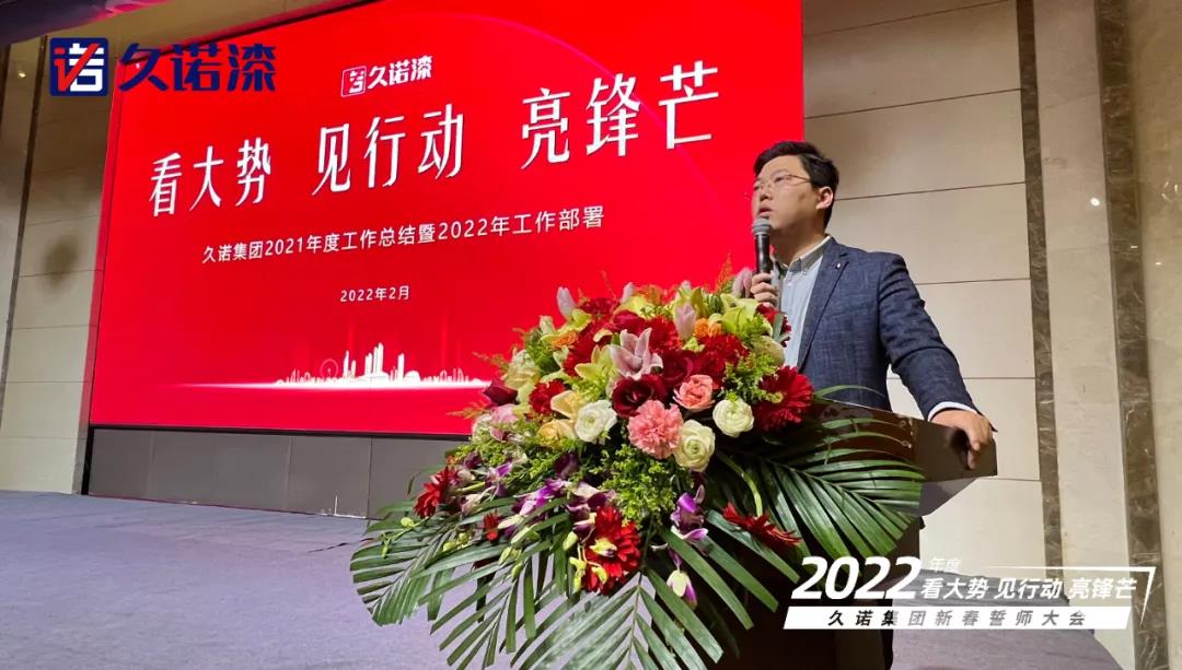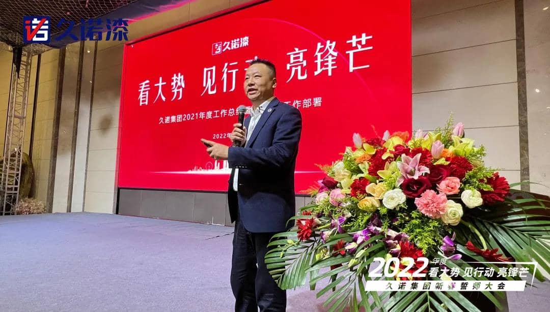 在誓師大會上,久諾集團董事長王志鵬,就2021年集團戰略規劃、銷售業績達成、組織建設、機制建設、基礎管理建設、降本增效、優質供應商引入、人才建設、文化建設、品牌建設等多個維度進行了回顧、分析和總結,對宏觀環境與全國市場動態進行了分享。特別強調,2022年作為精細化管理提升之年,夯管理、提品質、優服務、強營銷、降本增效將貫穿全年,在不確定中做確定的事情,做難而正確的事情,堅持長期主義、艱苦奮斗,努力成為一個讓自己滿意的自己,努力讓久諾成為高端外墻定制領導品牌。