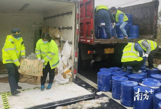 路政員火速趕往現(xiàn)場后發(fā)現(xiàn),原來是貨車開至樂廣高速K185路段時,右后輪突然爆胎導(dǎo)致車輛側(cè)翻,造成第二、第三車道堵塞,車上裝載的100余桶裝修用的化工品也掉落至路面,致使過往車輛紛紛減速避讓……現(xiàn)場險象環(huán)生,所幸無人員傷亡。路政員第一時間將現(xiàn)場情況報告監(jiān)控中心,請求更改沿線可變電子情報板內(nèi)容,遠端提醒司乘注意行車安全。