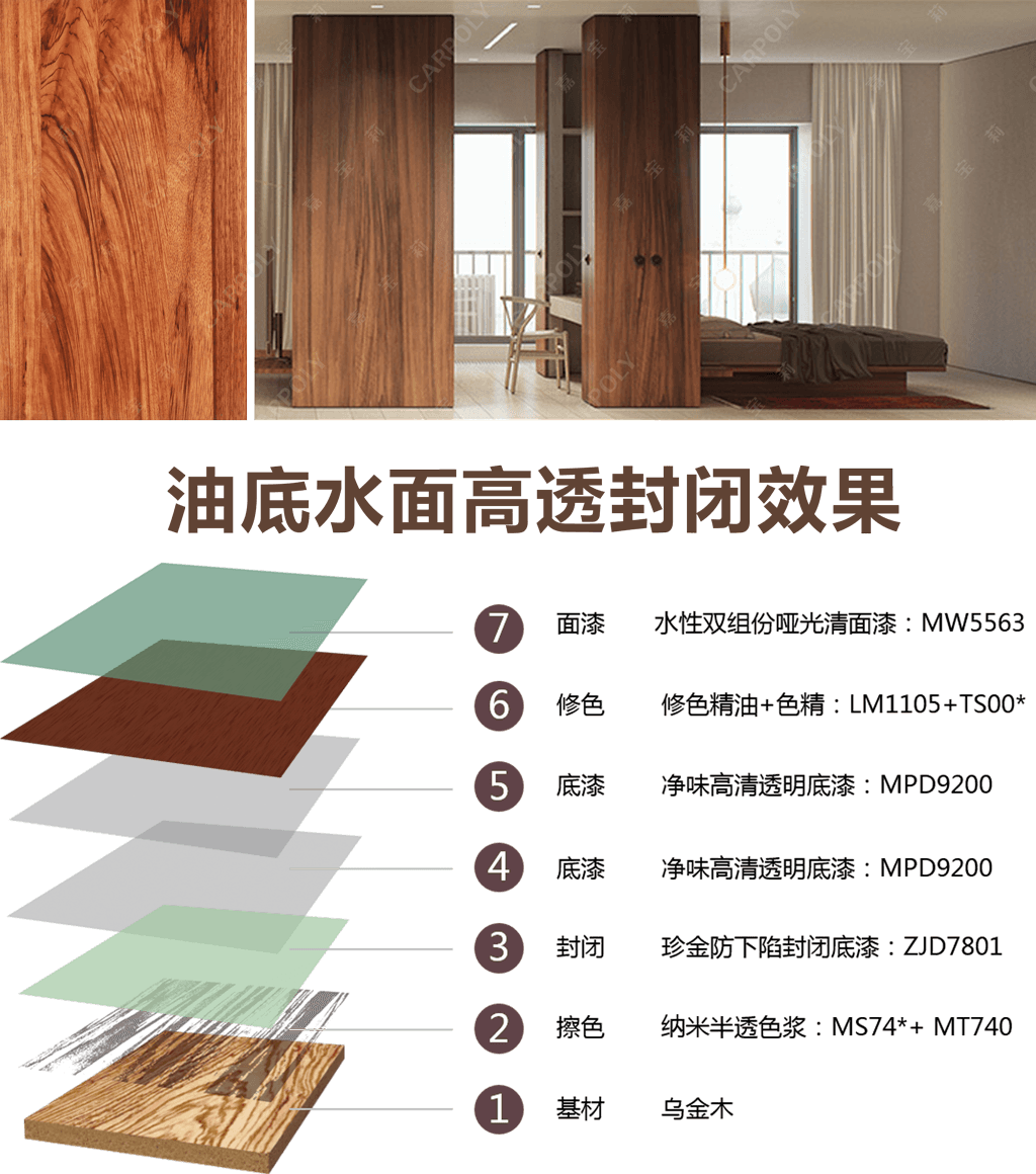本工藝適合中、淺導管基材的涂裝,如烏金木、愛里古夷蘇木、黑胡桃等。通過選用納米半透色漿底著色,搭配凈味高清底漆MPD9200和水性雙組份啞光清面漆MW5563,色彩層次豐盈,效果至清至透,氣味清新,是環保高透涂裝的不二之選。