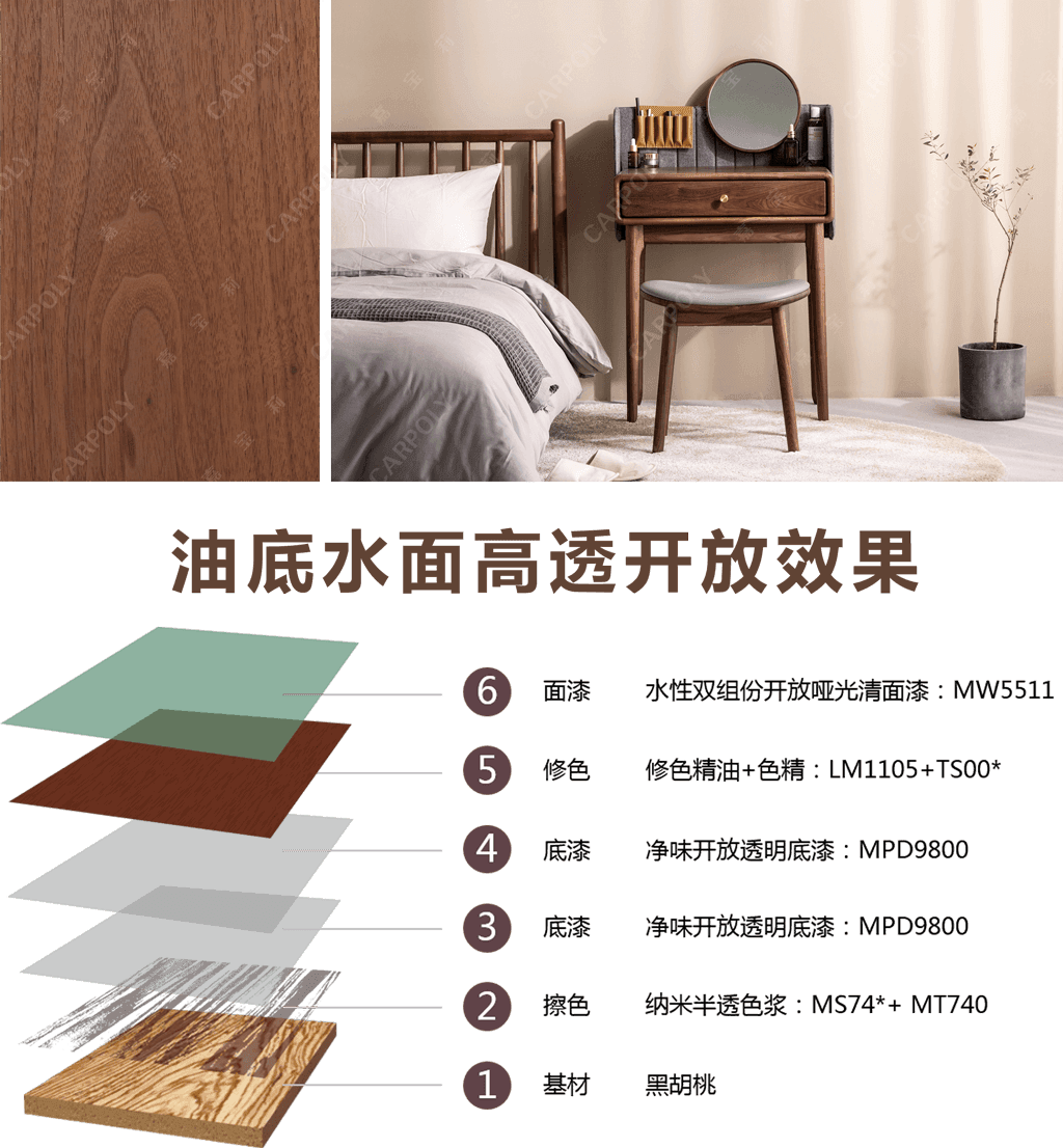 本工藝適合中、深導管基材的涂裝,如黑胡桃、橡木、白蠟木等。采用PU凈味開放透明底漆MPD9800,與MW5511搭配,既擁有PU的封閉性能,也具有水性的環保清味,效果薄透如無漆,手感爽滑,令家具之美內外兼修。