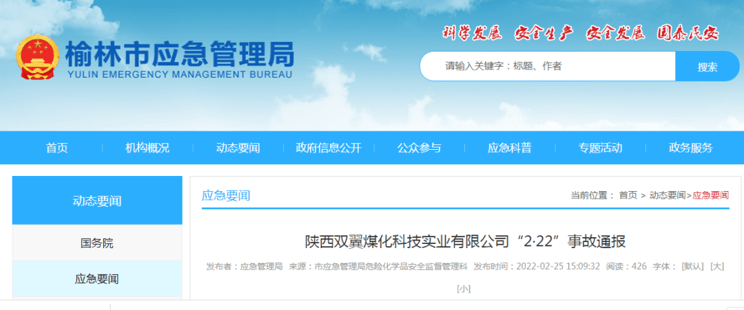 2022年2月22日上午9時,陜西雙翼煤化科技實業有限公司3名檢修人員在對新建的6號蘭炭爐文氏塔(停用)進行檢修動火作業過程中發生閃爆,造成3人死亡。事故發生后,榆林市應急局立即趕赴現場核實處置,依法暫扣該企業《安全生產許可證》,責令全面停產停業整頓,目前事故原因正在深入調查中。