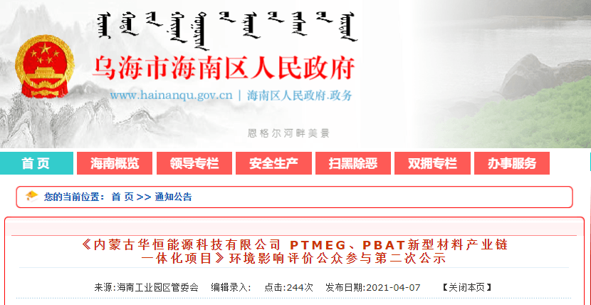 內蒙古華恒能源科技有限公司PTMEG、PBAT新型材料產(chǎn)業(yè)鏈一體化項目總投資105億元,建設地點為內蒙古自治區(qū)烏海經(jīng)濟開發(fā)區(qū)低碳產(chǎn)業(yè)園區(qū)。