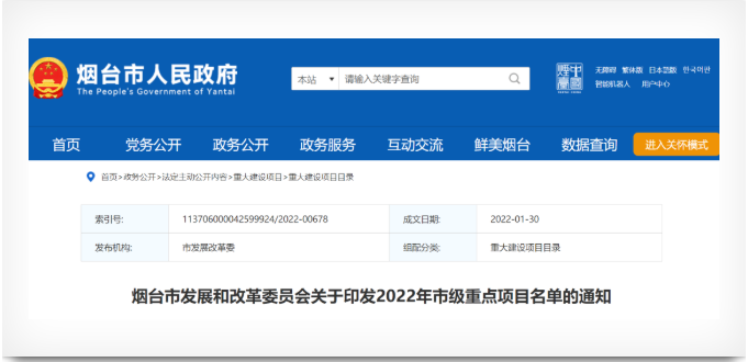 近期,煙臺市政府發布2022年煙臺市市級重點項目名單。