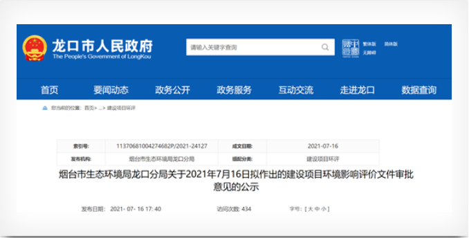 2021年7月,由煙臺市生態環境局對該項目進行環評審批。
