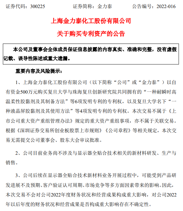近日,金力泰(或稱“公司”)發布公告,公司以自有資金500萬元購買復旦大學與珠海復旦創新研究院共同擁有的“一種耐瞬時高溫柔性膠黏劑及其制備方法”等6項發明專利的專利權,以及復旦大學名下“一種液晶屏膠黏劑及其使用方法”等4項發明專利的專利權。共10項專利權的評估價值合計為497.13萬元。經各方友好協商,公司以自有資金人民幣500萬元購買上述10項發明專利。