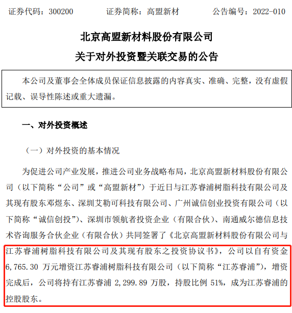 近日,膠粘劑行業上市公司高盟新材(或稱“公司”)公布,于近日與江蘇睿浦樹脂科技有限公司及其現有股東鄧煜東、深圳艾勒可科技有限公司、廣州誠信創業投資有限公司(“誠信創投”)、深圳市領航者投資企業(有限合伙)、南通威爾德信息技術咨詢服務合伙企業(有限合伙)共同簽署了《北京高盟新材料股份有限公司與江蘇睿浦樹脂科技有限公司及其現有股東之投資協議書》,公司以自有資金6765.3萬元增資江蘇睿浦樹脂科技有限公司(“江蘇睿浦”),增資完成后,公司將持有江蘇睿浦2299.89萬股,持股比例51%,成為江蘇睿浦的控股股東。