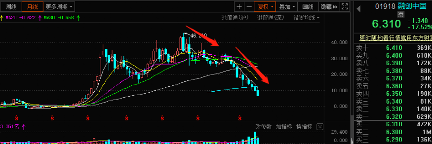 今日一跌,也讓融創中國傳出近5年新低,從2020年1月高點46.21港元(前復權)算起,跌幅達到了86%,市值從月2500億港元跌到僅剩349億港元。值得一提的是,基金君想起來在2018年的中期業績發布會上,融創中國創始人孫宏斌曾“喊話”投資者買融創股票,其表示如果是剛需買房無可厚非,如果是投資的話買房子不如買融創中國的股票,“股票以后漲幅會比房子多得多”。