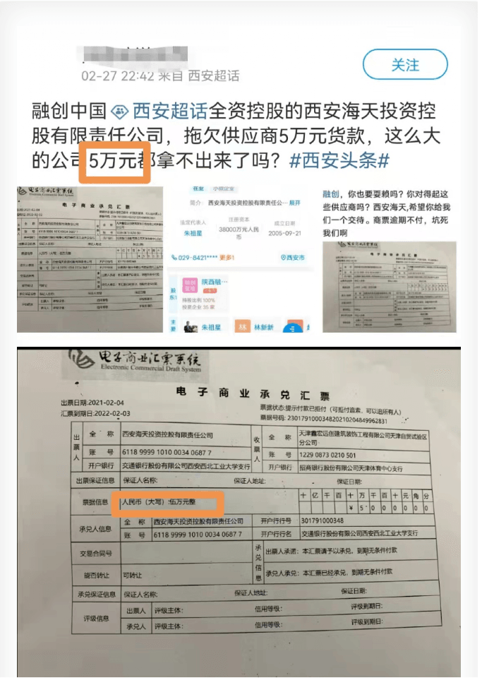 還有一條投訴涉及陜西融創全資控股的“西安海天投資控有限責任公司”,顯示拒付的金額僅有區區5萬元,票據到期日為2月3日。