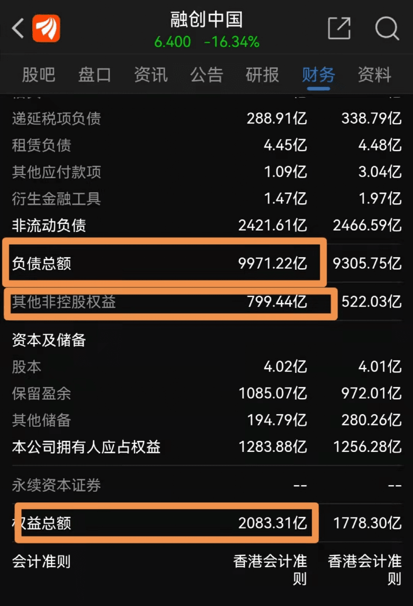 從截至2021年6月底的財務報表來看,融創中國總資產為12054.53億元,總負債9971.22億元,凈資產2083.31億元,資產負債率82.72%。但這里需要注意的是,2083億元的凈資產并不都歸屬于上市公司,其中有799億元是“其他非控股權益”(即“少數股東權益”),歸屬上市公司股東的權益實際為1283.88億元。也就是說,實際的負債率不止82.72%。