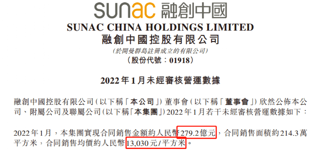 2022年1月融創中國銷售下滑幅度更明顯,當月其實現合同銷售金額約279.2億元,合同銷售面積約214.3萬平方米,合同銷售均價約13030元/平方米。而2021年1月,上述三項數據分別為:351.7億元、223.6萬平方米和15730元/平方米。兩組數據對比,銷售金額下降39%,銷售面積下降4%,銷售單價下降17%。