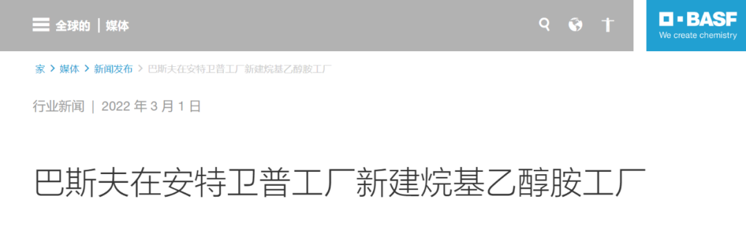 3月初,巴斯夫宣布在比利時安特衛普的一體化基地建造了一座新的世界級烷基乙醇胺生產工廠。計劃于2024年投產后,將把其烷基乙醇胺產品組合的全球年產能提高近30%,達到每年14萬噸以上,其中包括二甲基乙醇胺(DMEOA)和甲基二乙醇胺(MDEOA) 等。