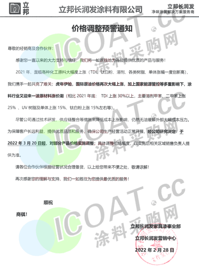 立邦:自3月1日起,對(duì)內(nèi)墻/外墻/木器/基材/輔材等全規(guī)格產(chǎn)品預(yù)計(jì)上調(diào)3%-10%。