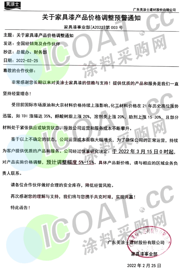 求生存,立邦、美涂士、展辰等多家涂料企業(yè)發(fā)函調(diào)漲