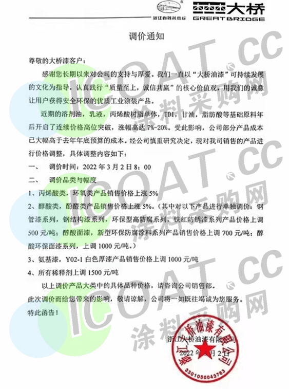 浙江大橋油漆:3月2日起,丙烯酸類、環(huán)氧類產(chǎn)品價(jià)格上漲5%,醇酸類、酚醛類產(chǎn)品上漲5%。氨基漆,Y02-1白色厚漆產(chǎn)品價(jià)格上調(diào)1000元/噸,所有稀釋劑上調(diào)1500元/噸。
