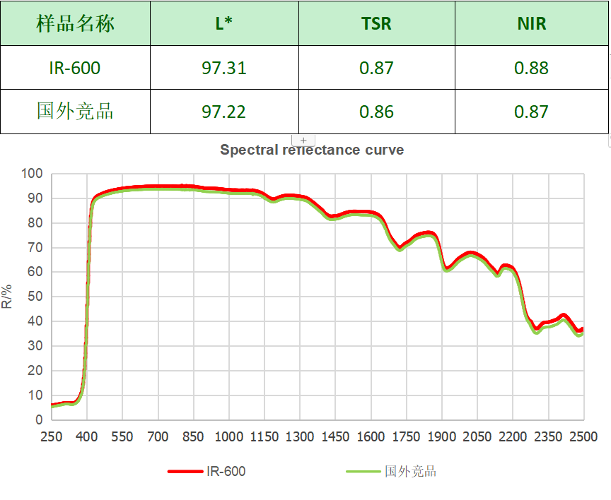 IR-600能夠反射近紅外線的新型二氧化鈦材料。由于合理的粒度及其分布控制,保證了在白色或淺色涂料及塑料體系中的應用。IR-600是專門為中高明度配方體系設計,使用IR-600后可以減少顏料級鈦白粉的使用量,降低生產成本。同時為涂層提供更高太陽光反射比,降低物體溫度,達到節能降耗的目的。