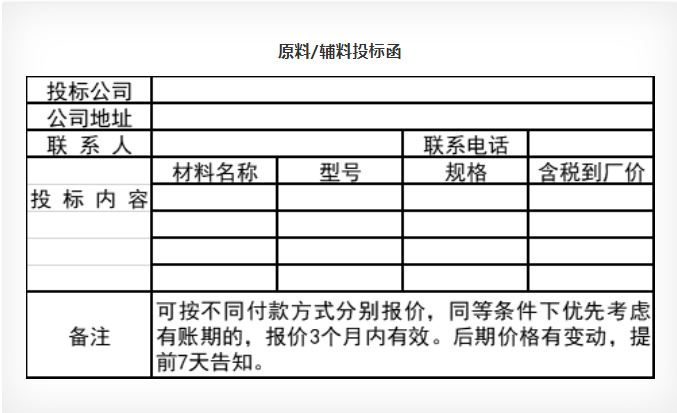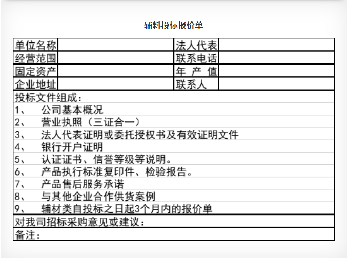 4、輔材類產(chǎn)品投標(biāo):產(chǎn)品執(zhí)行標(biāo)準(zhǔn)復(fù)印件、檢驗(yàn)報(bào)告,特種行業(yè)資質(zhì)證書、自投標(biāo)日起3個(gè)月以內(nèi)的產(chǎn)品報(bào)價(jià)單。
