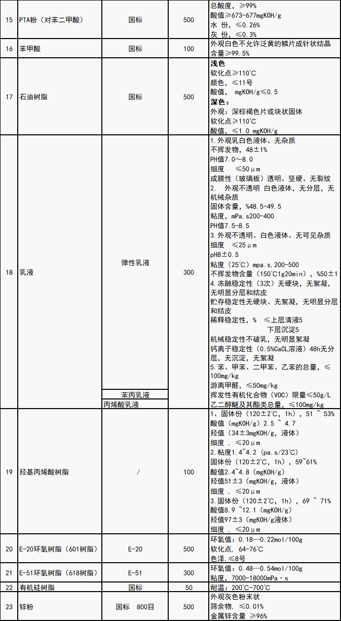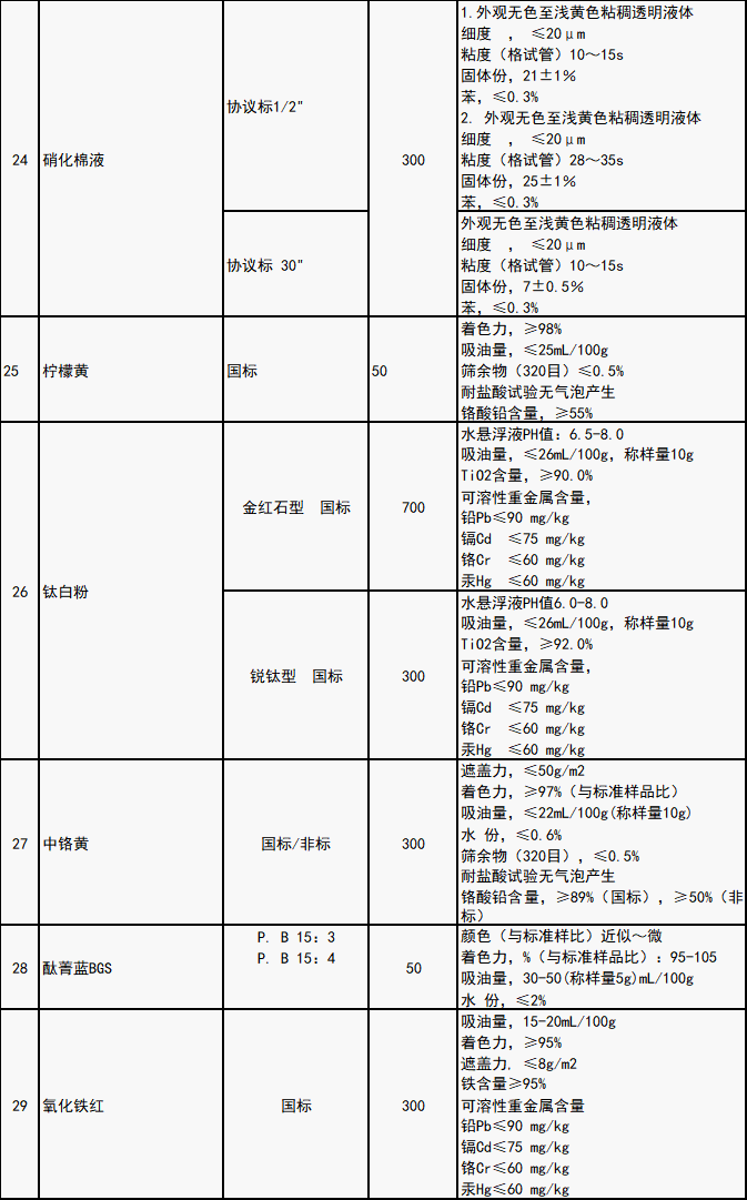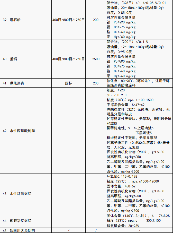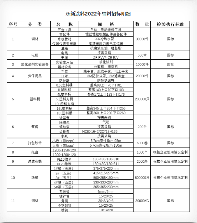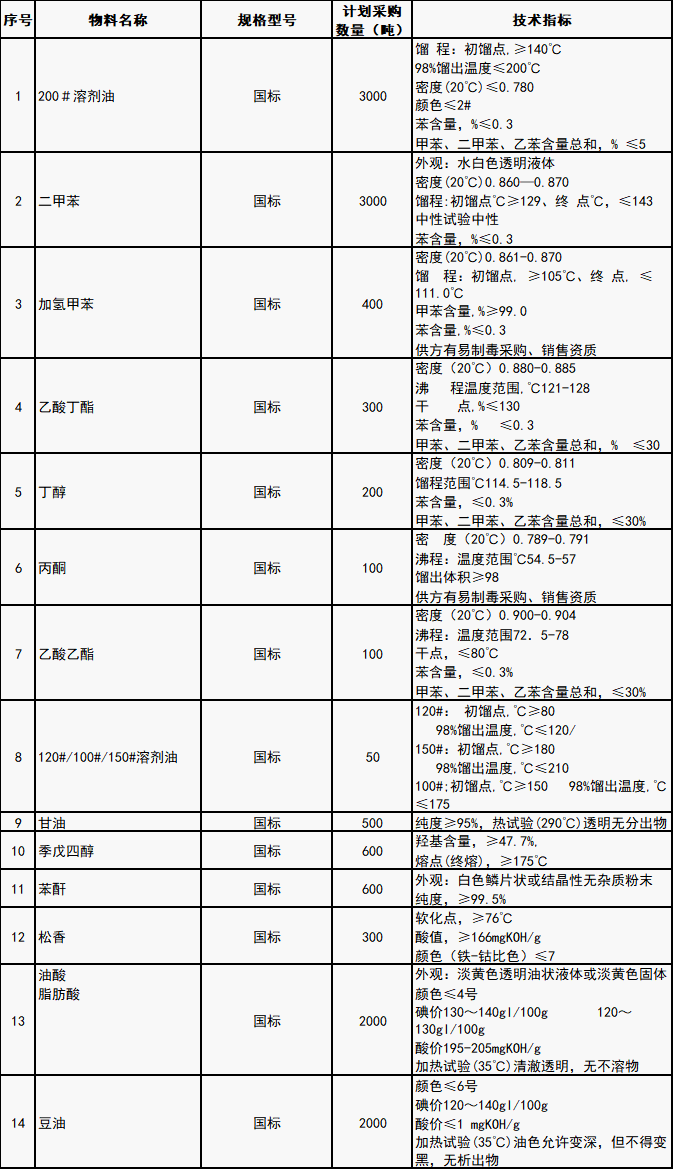 涂料生產(chǎn)主要原輔材料(見附件)。其他未列入目錄的涂料生產(chǎn)所需原料,廠家或貿(mào)易商均可按要求投標(biāo)。