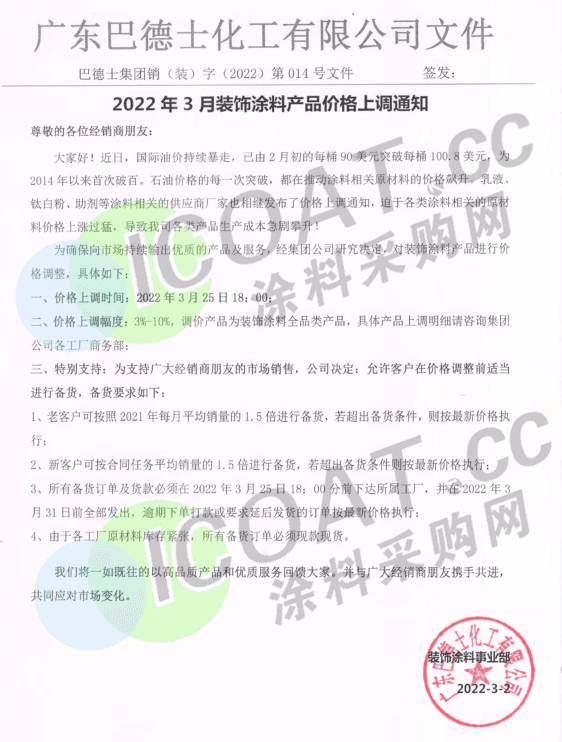近日,巴德士發(fā)布裝飾涂料產(chǎn)品價格上調(diào)通知,稱3月25日起,裝飾涂料全品類產(chǎn)品上漲3%-10%,并表示,由于各工廠原材料庫存緊張,所有備貨訂單必須現(xiàn)款現(xiàn)貨。