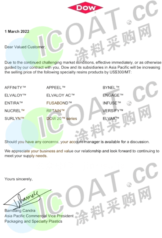 SKGC公司:3月15日起,將針對PRIMACOR™系列EAA產(chǎn)品進行全面提價,直接上漲250美元/噸(約合1577元/噸)。